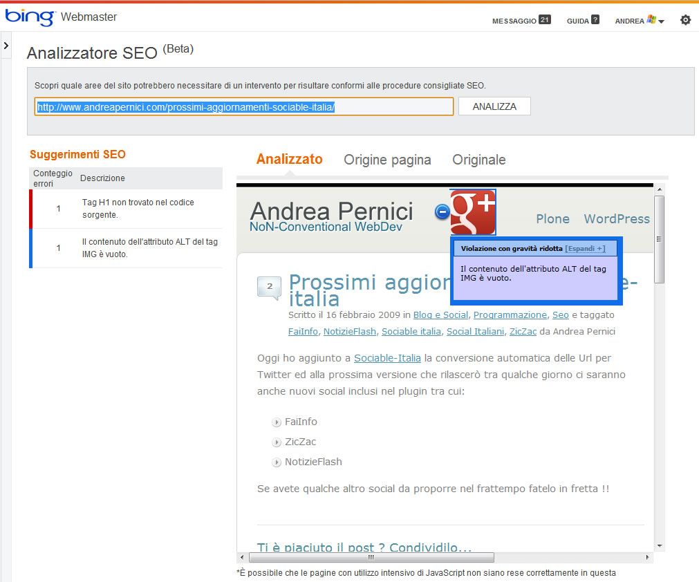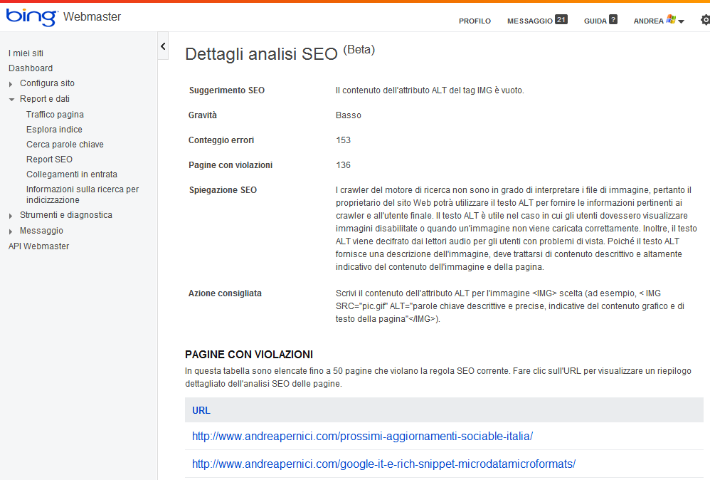 Bing ci aiuta ora ad identificare i problemi SEO dei nostri siti tramite un’analisi settimanale dei nostri siti. Tra gli elementi analizzati ci sono circa 15 fattori che sfociano in un elenco di errori rilevati con tanto di quantità e gravità dei problemi rilvati.