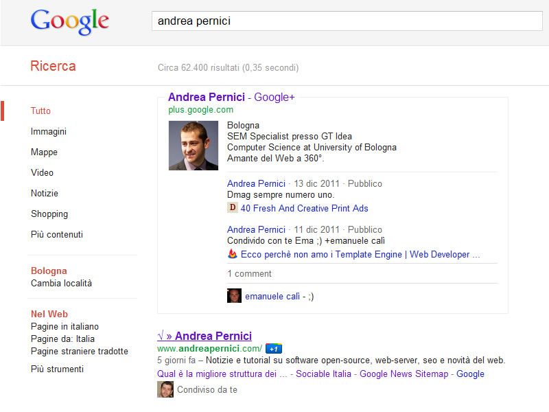 Aggiungo alle ore 13:52 che facendo una ricerca per nome e cognome da loggato ora vedo la seguente cosa (non è questione di Author Markup, ma ritengo che sia interessante la cosa):