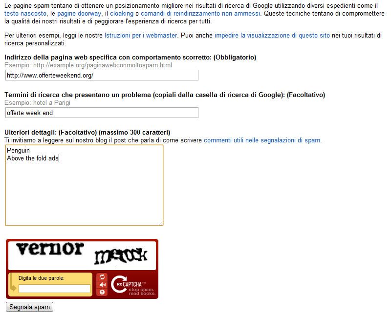 Esiste lo spam report https://www.google.com/webmasters/tools/spamreportform?hl=it che potete compilare in questo modo…