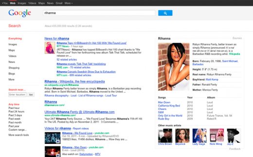 Un altro test, stavolta segnalato su The Next Web, riguarda le SERP di Google. E si tratta di un avvistamento davvero interessante: sembra infatti che il motore di ricerca stia visualizzando sulla destra della pagina un piccolo “box informativo” riguardante brand e personaggi famosi.