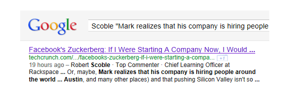 Ed ecco il risultato su Google, ottenuto cercando “nome commentatore” e “titolo” (per esempio – “Robert Scoble Learning Officer * Chief Rackspace”). In questo modo potremmo scoprire tutti i suoi commenti postati tramite il plugin di Facebook, in qualsiasi blog.