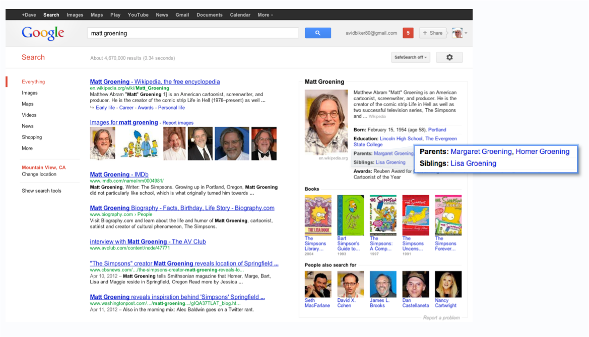 Ma “Knowledge Graph” cambia le cose. Il “graph” sviluppato da Google, infatti, rende il motore di ricerca un elemento più vicino alla realtà degli utenti e consente di ricevere risposte su cose, persone, luoghi, celebrità, squadre sportive, città, edifici, personaggi storici, opere d’arte. Tutto direttamente all’interno del motore di ricerca, tutto direttamente passando per i risultati del motore di ricerca.
