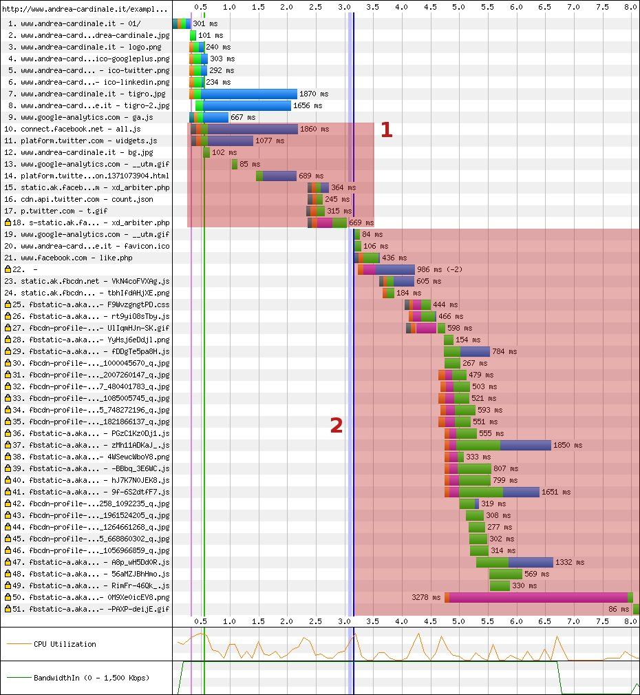 Nel primo riquadro ho racchiuso le richieste delle risorse, relative ai social widgets, che richiamiamo direttamente dalla nostra pagina.