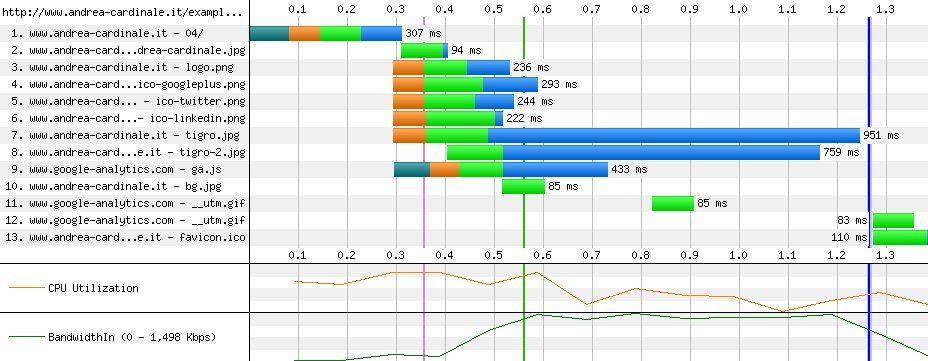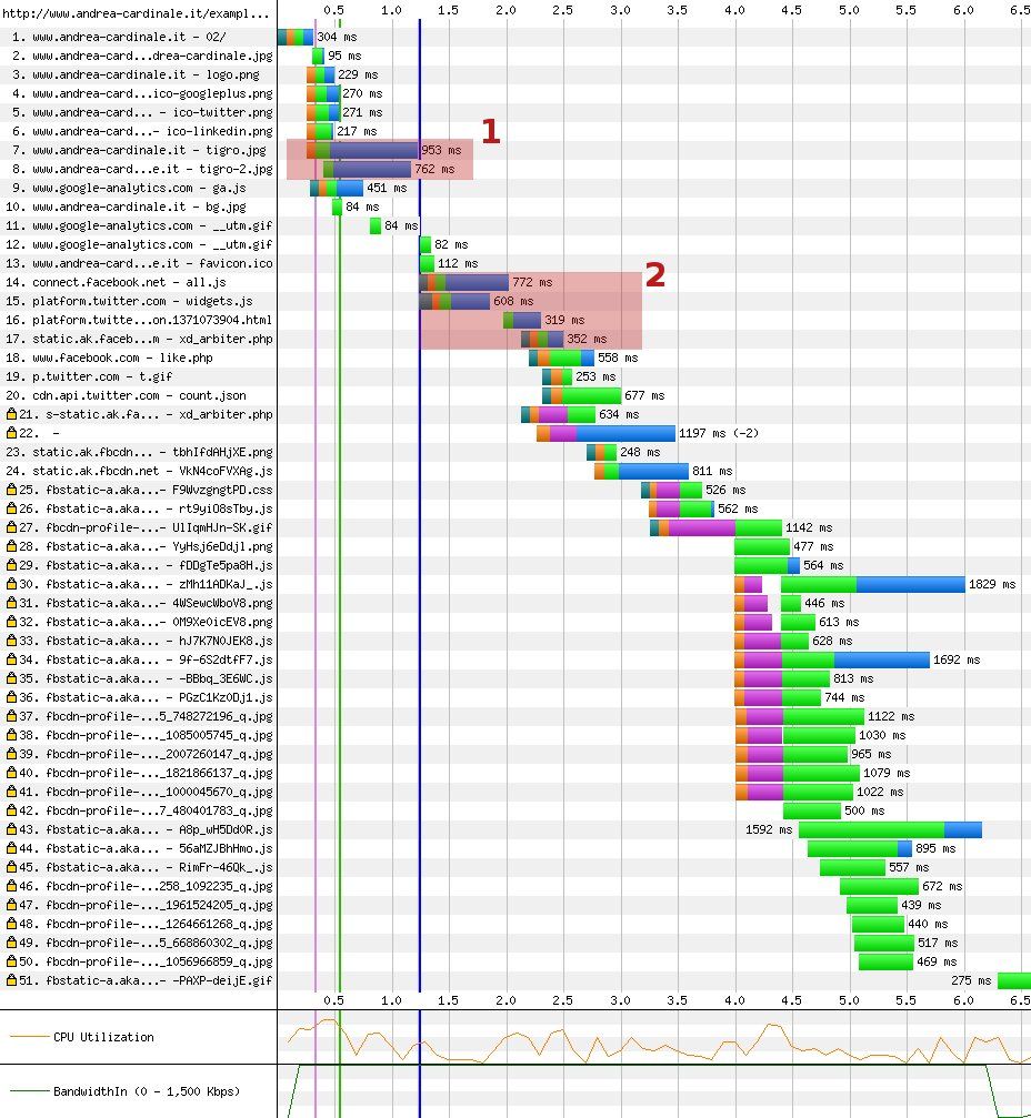 Un altro aspetto non immediato da constatare è che il tempo di caricamento delle due immagini (tigro.jpg e tigro-2.jpg) è aumentato passando dai circa 800 millisecondi ai circa 1700 millisecondi, poiché le risorse racchiuse nel primo riquadro (evidenziato in rosso) vengono scaricate in contemporanea alle due immagini.
