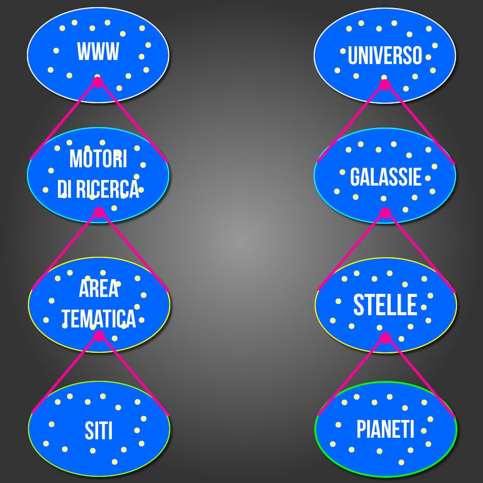 È un po come l’universo (WWW) dove abbiamo galassie (Motori di Ricerca) che contengono stelle (Area Tematiche) che contengono pianeti (siti web). Il tutto è molto semplificato e banalizzato, ma penso che possa essere utile a capire quanto può diventare complesso e incerto un sistema di questo tipo e sopratutto quanto lo diventerà con l’andare avanti del tempo.