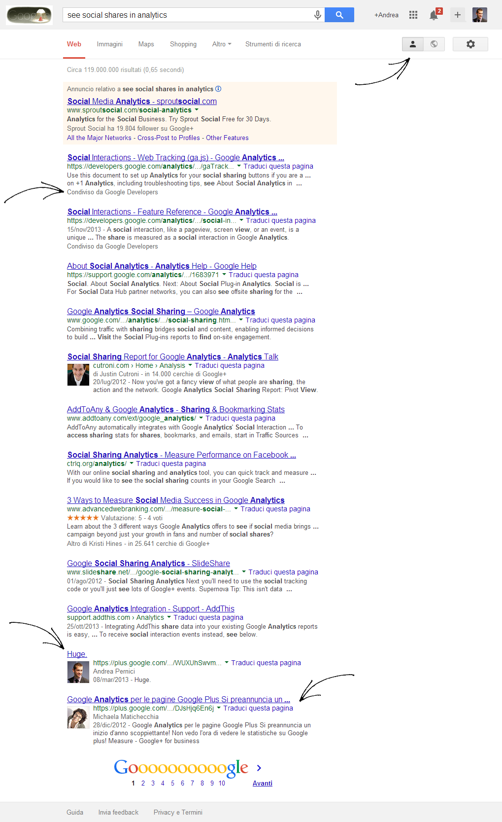 Per ora non posso che consigliarvi nuovamente di leggere la voce Social Search sul Wiki e di dare uno sguardo alle slide su Google+ che avevo portato ad una lezione per l’Università di Bologna oltre a quelle che Giorgio ha portato ieri al BTO.