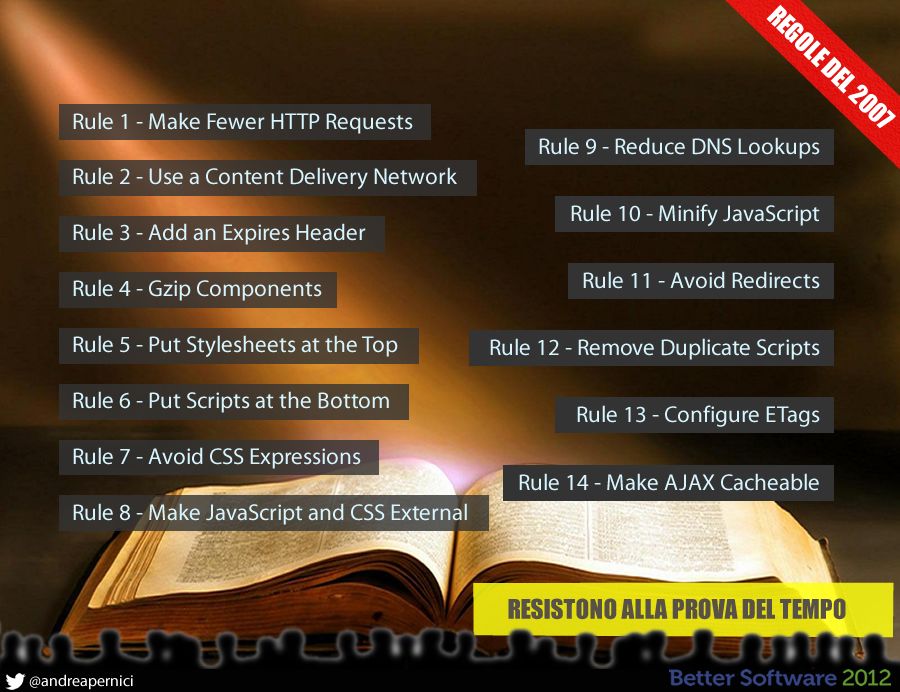 In realtà la risposta c’è ed è anche certa e molto efficace! Seguendo le best practice definite da Steve Souders nel lontano 2007 con il suo libro “High Performance Web Sites” ha definito una sorta di Bibbia delle Web Performance che resiste alla prova del tempo.