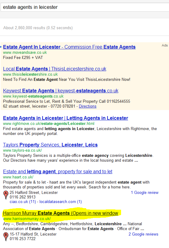Il risultato “Harrison Murray Estate Agency” vede accanto la voce “(Opens in new window”. Una dicitura che certamente non aiuta l’utente – visto anche che i risultati vengono sempre aperti nella stessa finestra – e che appare strana.