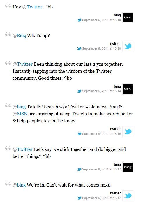 Le due società hanno annunciato la novità in modo tutt’altro che convenzionale: una conversazione su Twitter, con i due account @bing e @twitter, ha permesso ai più attenti di captare qualcosa di nuovo nello scenario globale della rete.