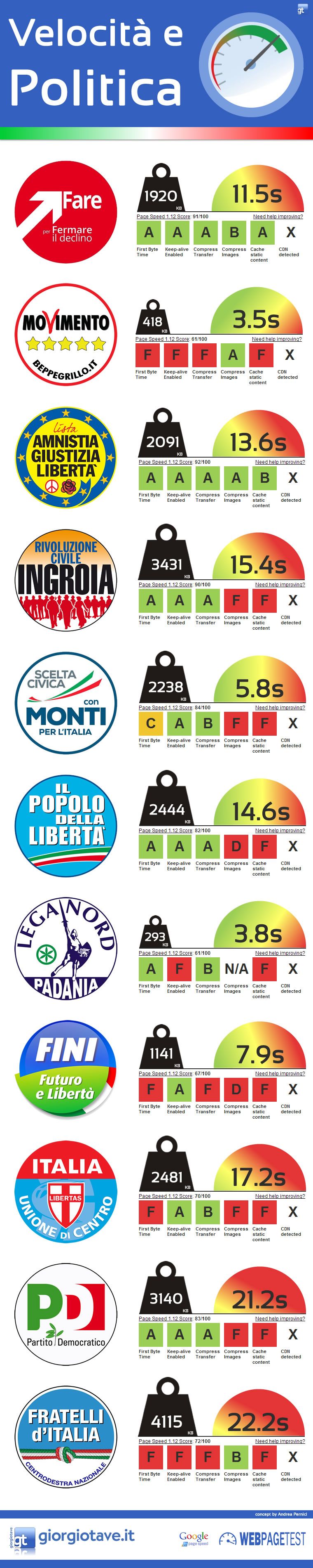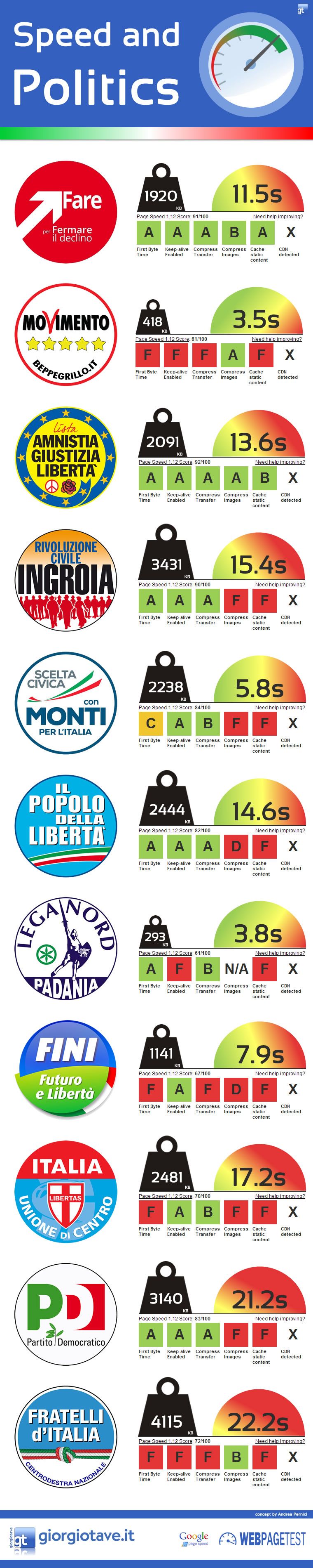 Di seguito troverete un’analisi condotta utilizzando WebPageTest e Google PageSpeed, prendendo in esame, come tempi e pesi finali inseriti nell’infografica, il migliore risultato ottenuto tra analisi e video simulazione (in alcuni video con SPOF) delle homepage dei siti politici. In ogni caso, all’interno di questa pagina troverete tutti i dati.